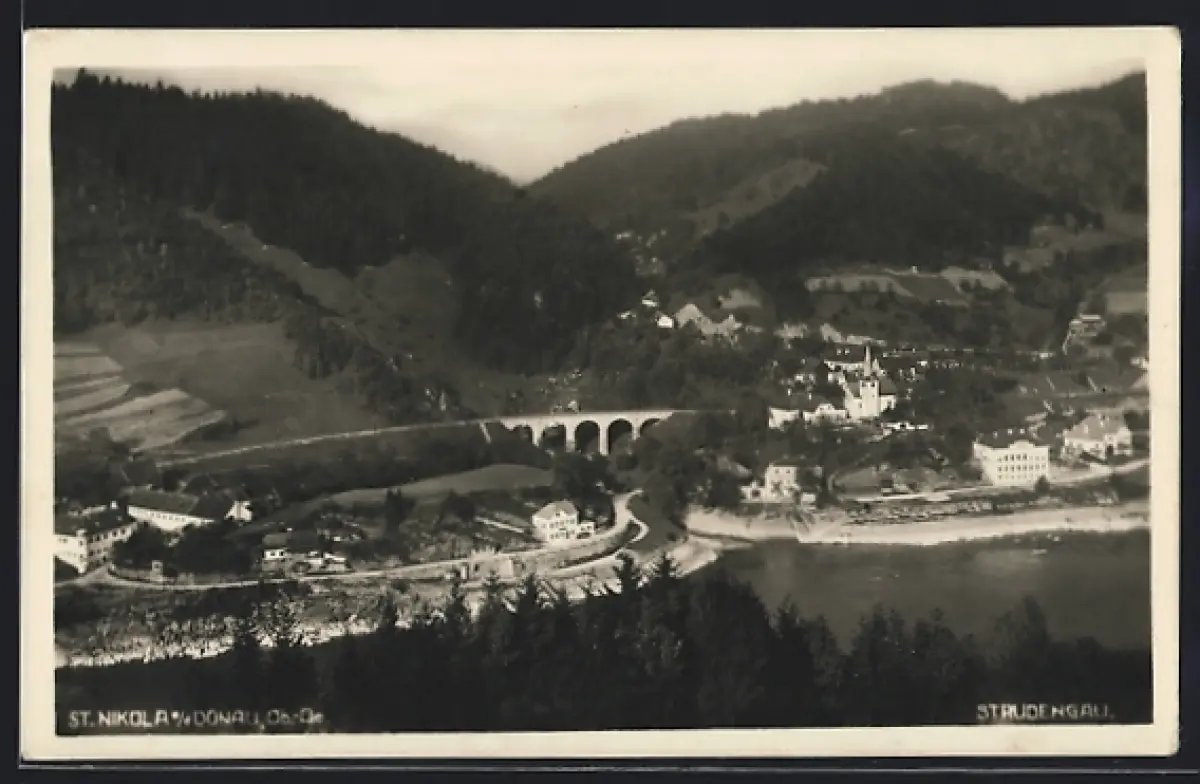 AK St. Nikola a. d. Donau, Teilansicht mit Viadukt