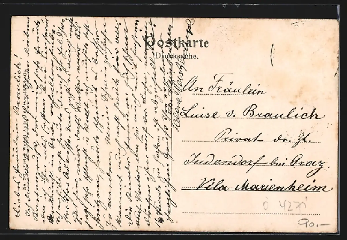 Personenbezogene Daten auf der Rückseite der Karte wurden durch blauen Textmarker unkenntlich gemacht. Die blauen Stellen sind auf die Vorderseite durchgeweicht und wirken sich negativ auf das Postkartenfoto aus