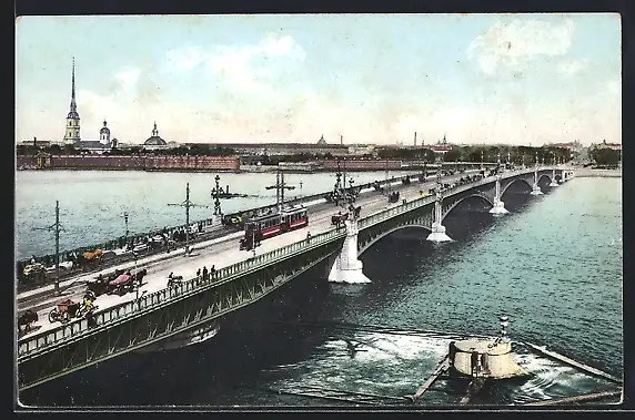 AK St. Petersbourg, Strassenbahn auf der Troitzky-Brücke, Pont de Troitzky