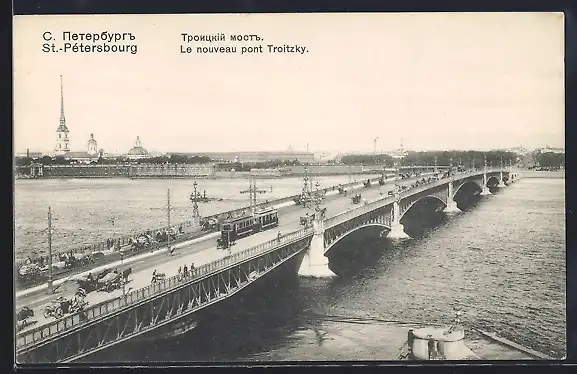 AK St. Petersburg, Le nouveau pont Troitzky, Brückenansicht mit Strassenbahn, Kutschen