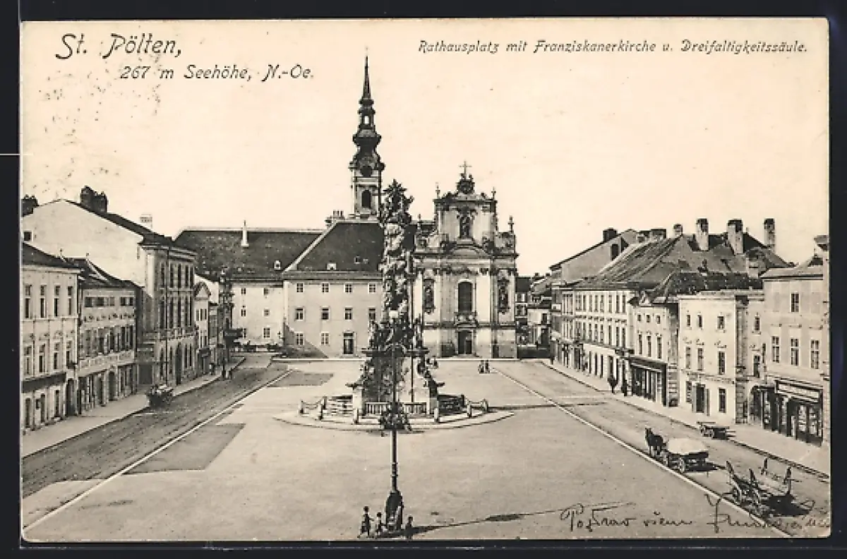 AK St. Pölten, Rathausplatz mit Franziskanerkirche u. Dreifaltigkeitssäule