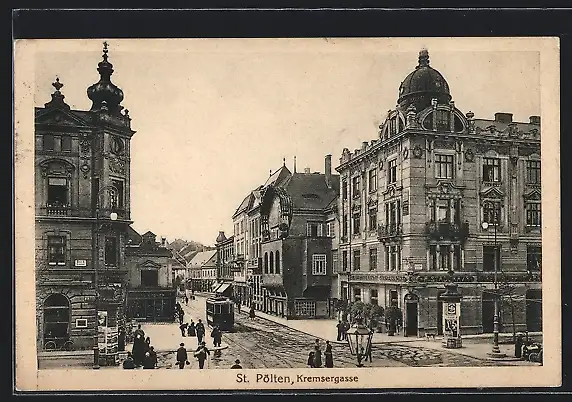 AK St. Pölten, Strassenbahn in der Kremserstrasse, Restaurant Kaiserkrone, Litfasssäulen