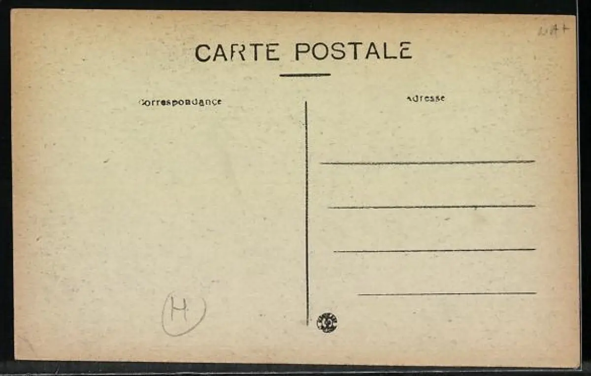 Personenbezogene Daten auf der Rückseite der Karte wurden durch blauen Textmarker unkenntlich gemacht. Die blauen Stellen sind auf die Vorderseite durchgeweicht und wirken sich negativ auf das Postkartenfoto aus