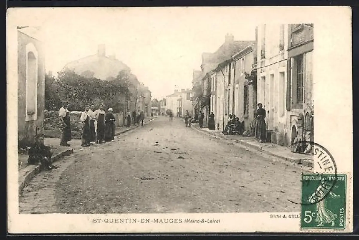 AK St-Quentin-en-Mauges /Maine-et-Loire, Scène de rue animée avec habitants et maisons traditionnelles