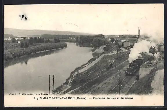 AK St-Rambert-d`Albon, Panorama des îles et du Rhône avec train à vapeur