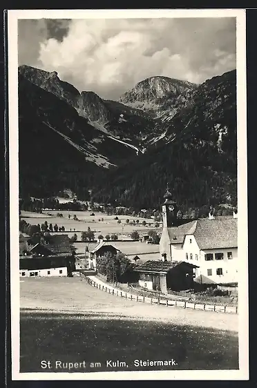 AK St. Rupert am Kulm, Ortsansicht mit Kirche vor dem Gebirge