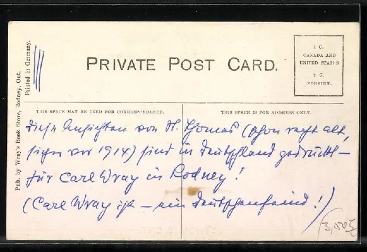 Personenbezogene Daten auf der Rückseite der Karte wurden durch blauen Textmarker unkenntlich gemacht. Die blauen Stellen sind auf die Vorderseite durchgeweicht und wirken sich negativ auf das Postkartenfoto aus