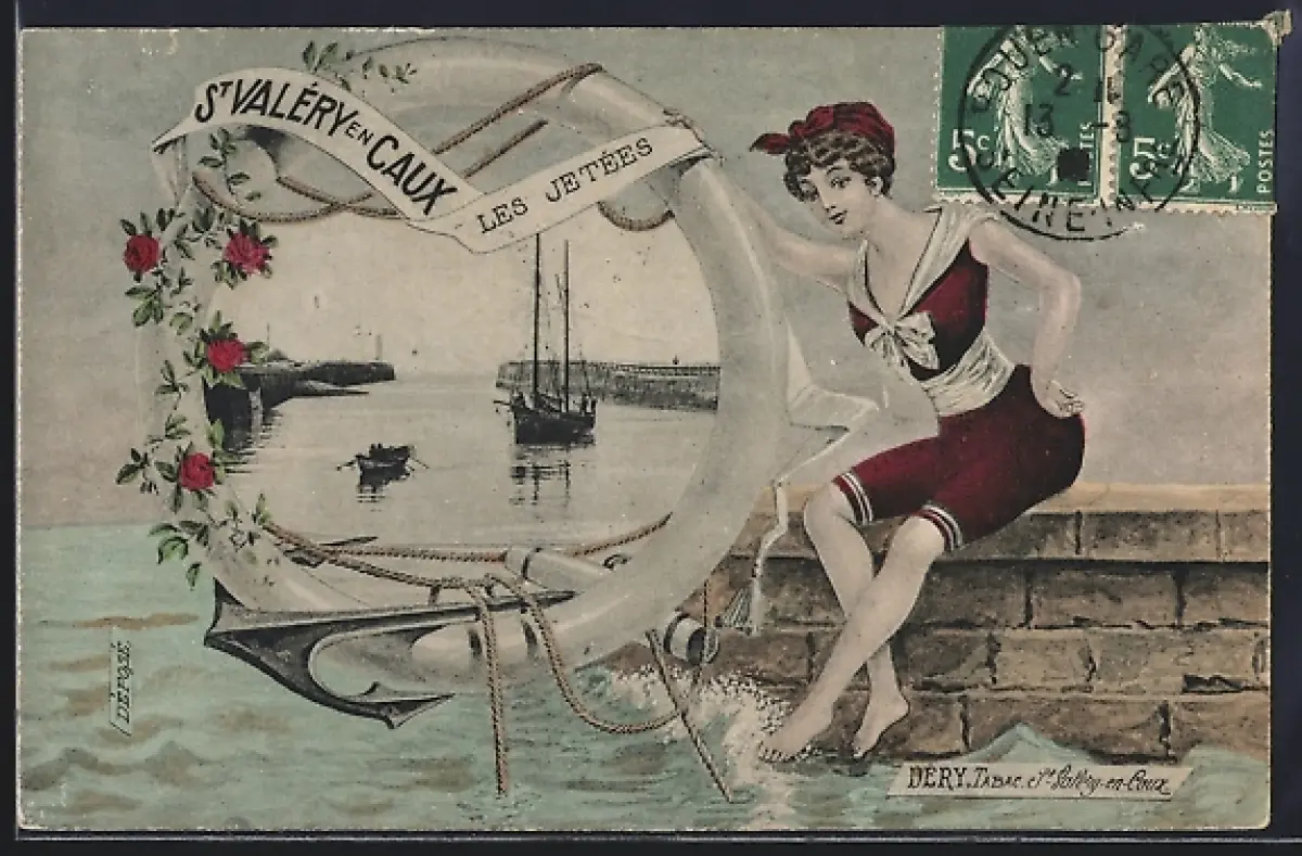 AK St Valéry-en-Caux, Les Jetées avec une femme en tenue de bain et des bateaux au loin