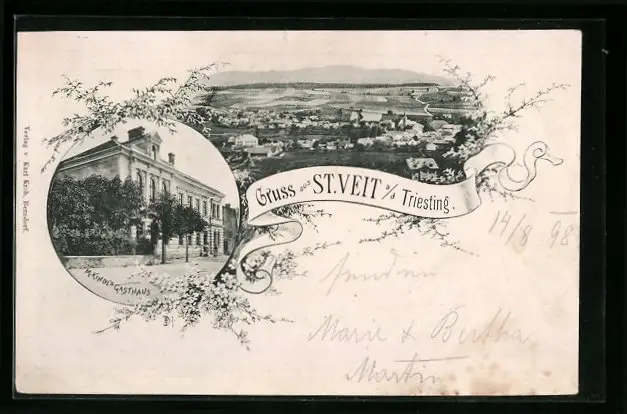AK St. Veit a. d. Triesting, M. Kindls Gasthaus, Ortsansicht aus der Vogelschau