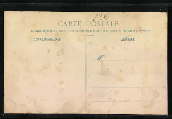 Personenbezogene Daten auf der Rückseite der Karte wurden durch blauen Textmarker unkenntlich gemacht. Die blauen Stellen sind auf die Vorderseite durchgeweicht und wirken sich negativ auf das Postkartenfoto aus
