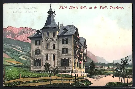 AK St. Vigil in Enneberg, Hotel Monte Sella im Abendlicht
