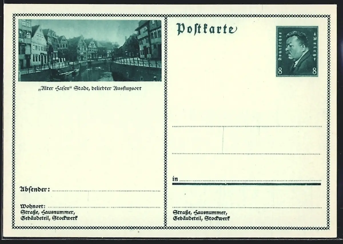 Personenbezogene Daten auf der Rückseite der Karte wurden durch blauen Textmarker unkenntlich gemacht. Die blauen Stellen sind auf die Vorderseite durchgeweicht und wirken sich negativ auf das Postkartenfoto aus