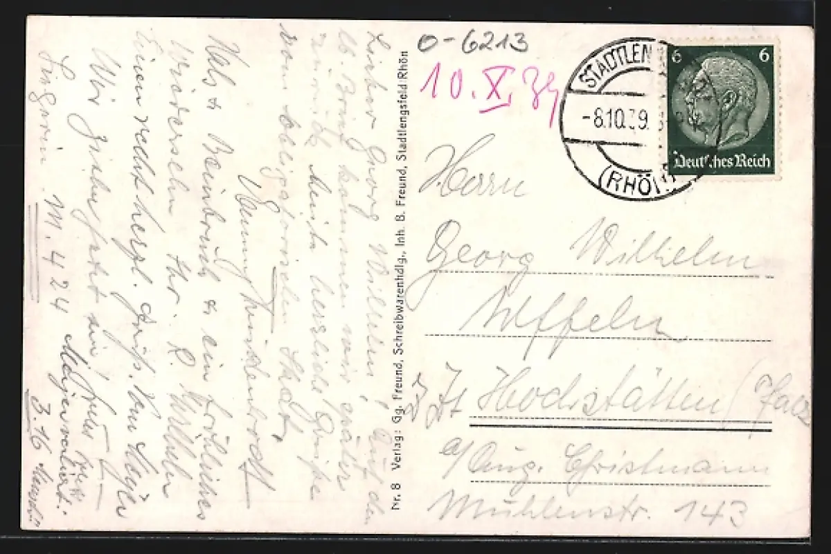Personenbezogene Daten auf der Rückseite der Karte wurden durch blauen Textmarker unkenntlich gemacht. Die blauen Stellen sind auf die Vorderseite durchgeweicht und wirken sich negativ auf das Postkartenfoto aus