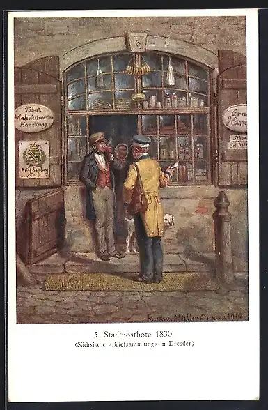 AK Stadtpostbote vor Tabak-Handlung, Hund