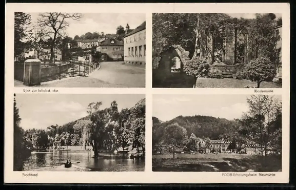 AK Stadtroda /Thür., FDGB-Erholungsheim Neumühle, Jakobskirche, Klosterruine, Stadtbad