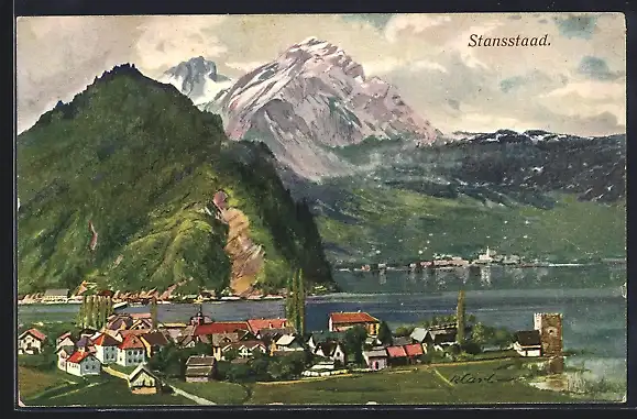 AK Stansstad, Ortsansicht mit Gebirge und Vierwaldstätter See