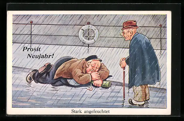 AK Stark angefeuchtet, Betrunkener liegt im Regen, Rettungsring
