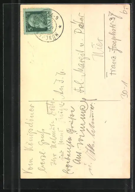 Personenbezogene Daten auf der Rückseite der Karte wurden durch blauen Textmarker unkenntlich gemacht. Die blauen Stellen sind auf die Vorderseite durchgeweicht und wirken sich negativ auf das Postkartenfoto aus
