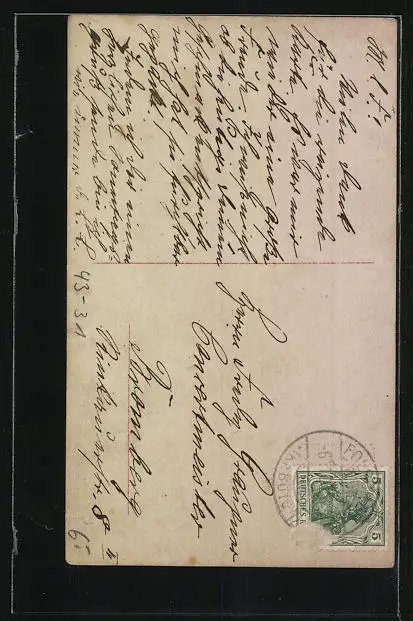 Personenbezogene Daten auf der Rückseite der Karte wurden durch blauen Textmarker unkenntlich gemacht. Die blauen Stellen sind auf die Vorderseite durchgeweicht und wirken sich negativ auf das Postkartenfoto aus