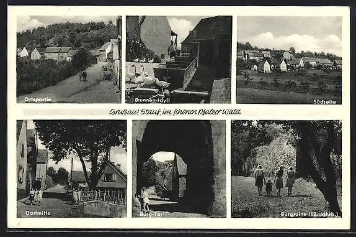 AK Stauf / Pfalz, Ortspartie, Brunnen-Idyll, Burgtor, Burgruine