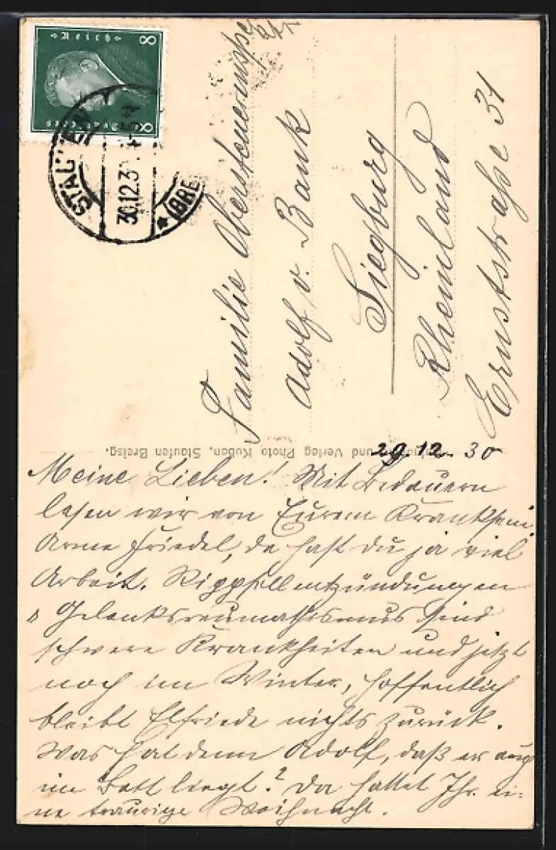 Personenbezogene Daten auf der Rückseite der Karte wurden durch blauen Textmarker unkenntlich gemacht. Die blauen Stellen sind auf die Vorderseite durchgeweicht und wirken sich negativ auf das Postkartenfoto aus