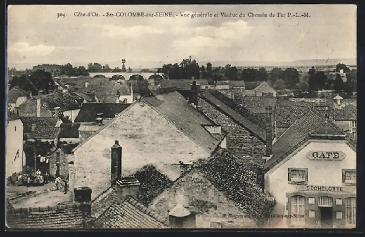 AK Ste-Colombe-sur-Seine, Vue generale et Viaduc du Chemin de Fer, Cafe