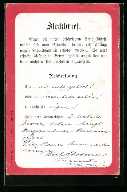 AK Steckbrief, Gegen die unten beschriebene Persönlichkeit..., Schreibfaul