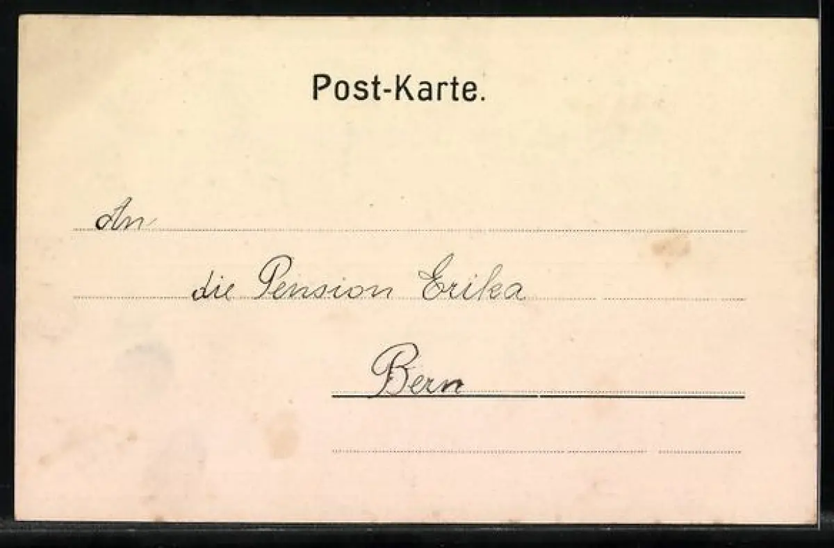 Personenbezogene Daten auf der Rückseite der Karte wurden durch blauen Textmarker unkenntlich gemacht. Die blauen Stellen sind auf die Vorderseite durchgeweicht und wirken sich negativ auf das Postkartenfoto aus
