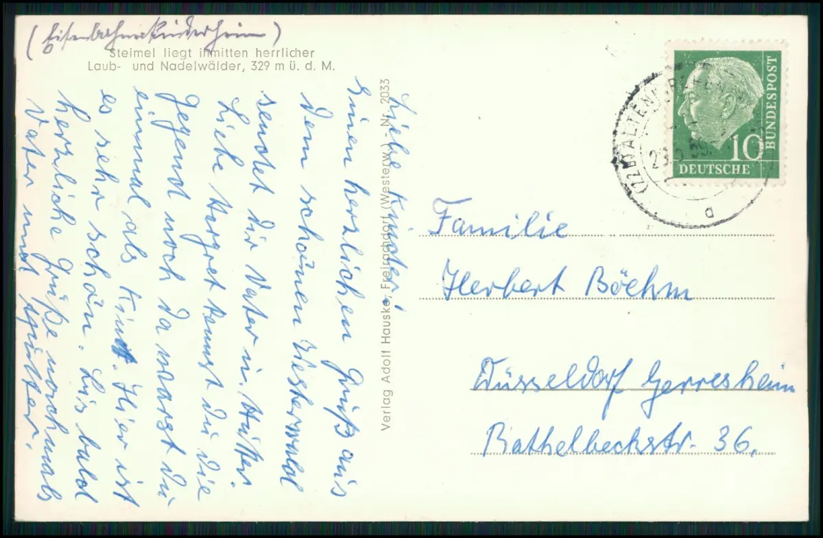 Mit 10 Pfennig Bundespost-Briefmarke (Theodor Heuss), klarer Stempel Cleveburg 1958. Handschriftliche Mitteilung an Familie Herbert Böhm, Düsseldorf-Gerrresheim.