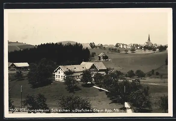 AK Stein, Erholungsheim Schachen und Ortsansicht mit Kirche