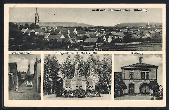 AK Steinbockenheim /Rheinh., Rathaus, Kriegerdenkmal, Strassenpartie