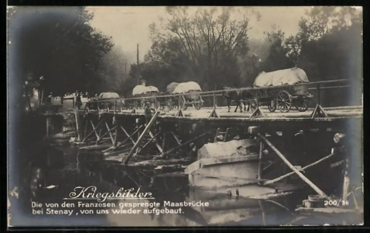 AK Stenay, Pont de la Meuse reconstruit après destruction par les Francais, avec charrettes traversant