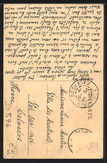 Personenbezogene Daten auf der Rückseite der Karte wurden durch blauen Textmarker unkenntlich gemacht. Die blauen Stellen sind auf die Vorderseite durchgeweicht und wirken sich negativ auf das Postkartenfoto aus