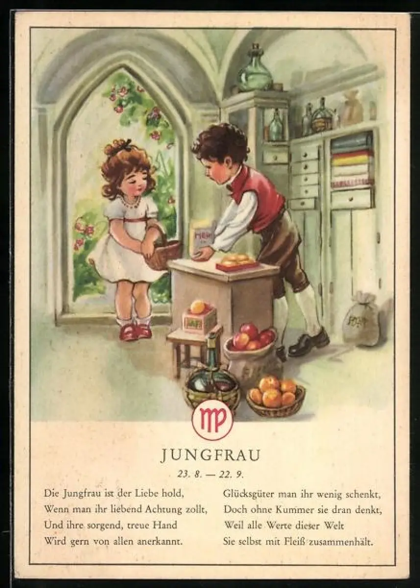AK Sternzeichen Jungfrau, Mädchen kauft Mehl im Gemischtwarenladen