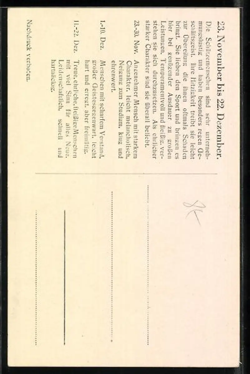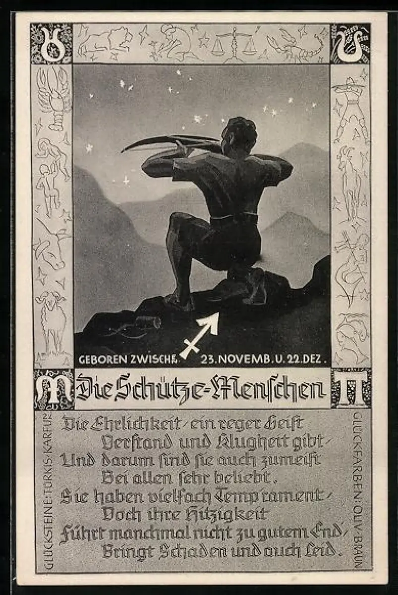 AK Sternzeichen Schütze, Eigenschaften der Schütze-Menschen, Schütze mit Armbrust auf einem Berggipfel