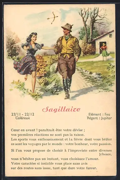 AK Sternzeichen Schütze, Pfeil u. Bogen, Jäger und zwei Mädchen, Gedicht