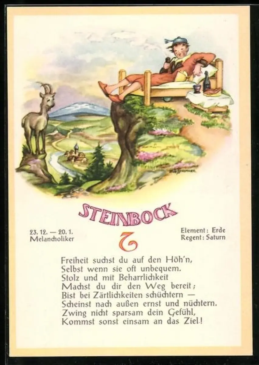 AK Sternzeichen Steinbock, Mann in einem Bett auf einem Berg