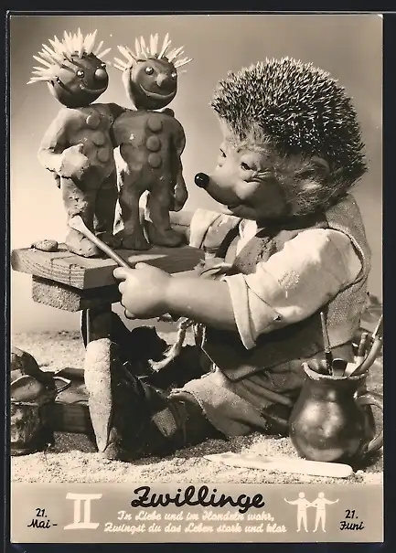 AK Sternzeichen Zwilling, Mecki bastelt zwei Figuren aus Ton
