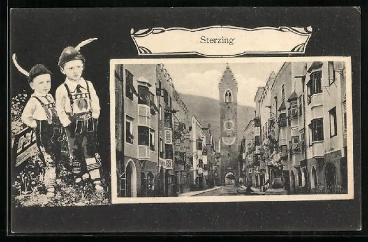 AK Sterzing, Strassenpartie am Zwölferturm, Jungen in Tracht