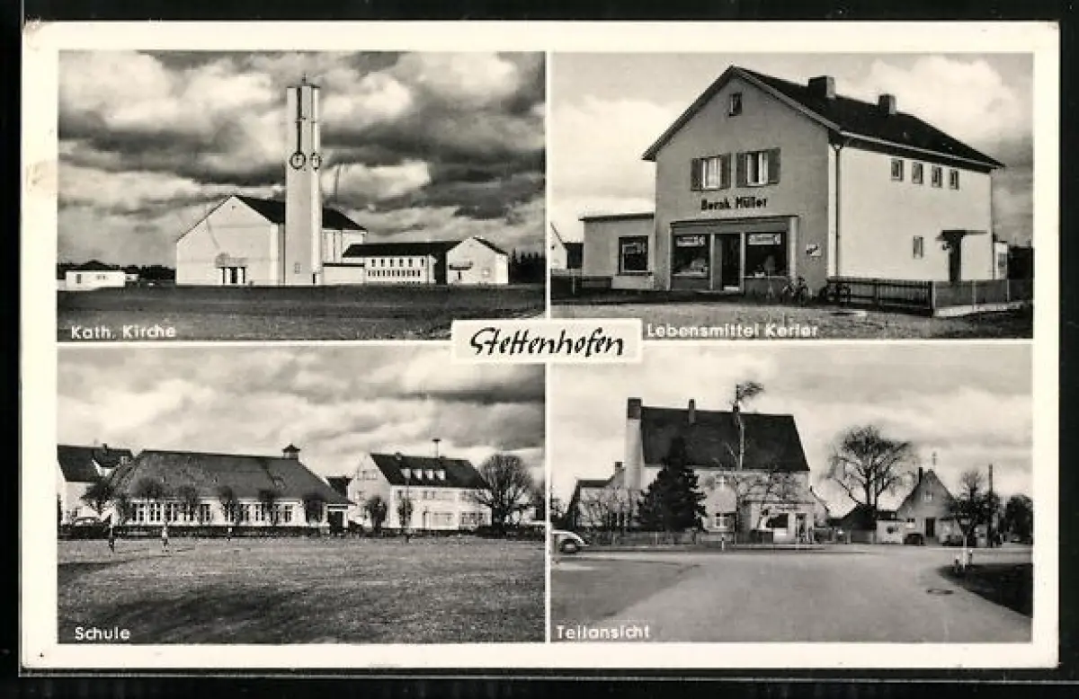 AK Stettenhofen, Lebensmittel-Geschäft Bernh. Müller, Katholische Kirche, Schule