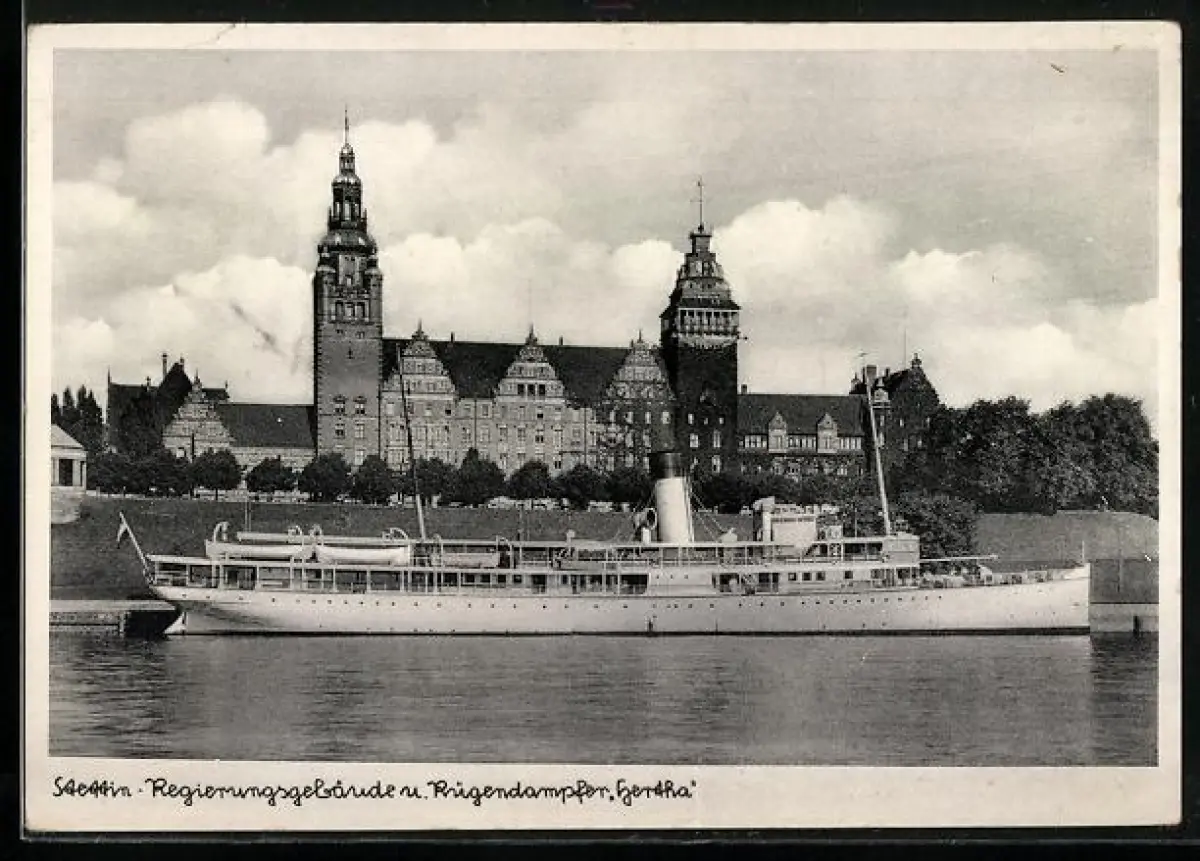 AK Stettin, Rügendampfer Hertha an der Hakenterrasse vor dem Regierungsgebäude, Passagierschiff