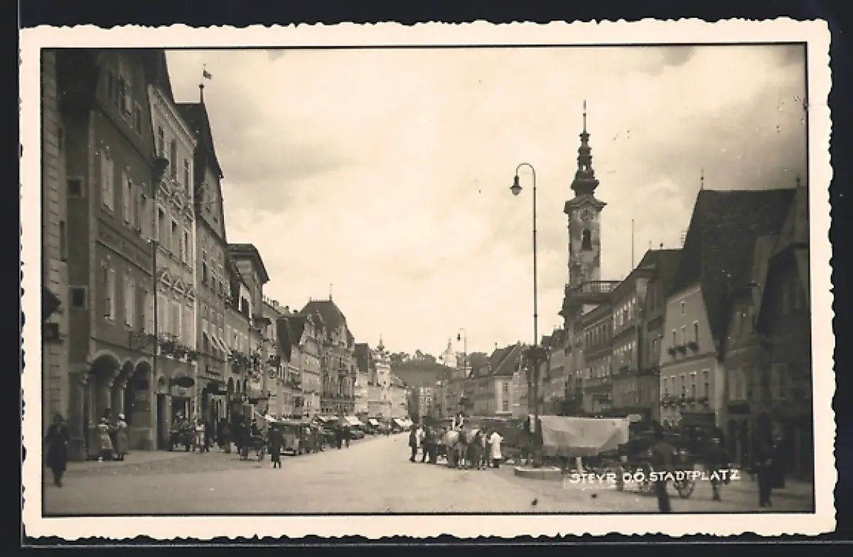 AK Steyr /O. Ö., Stadtplatz mit Geschäften