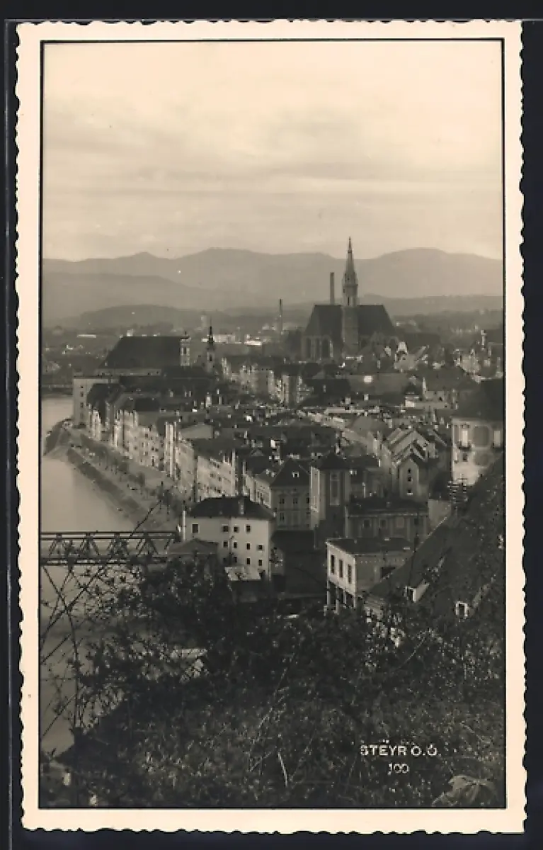 AK Steyr /O.Ö., Ortsansicht mit Kirche gegen die Berge
