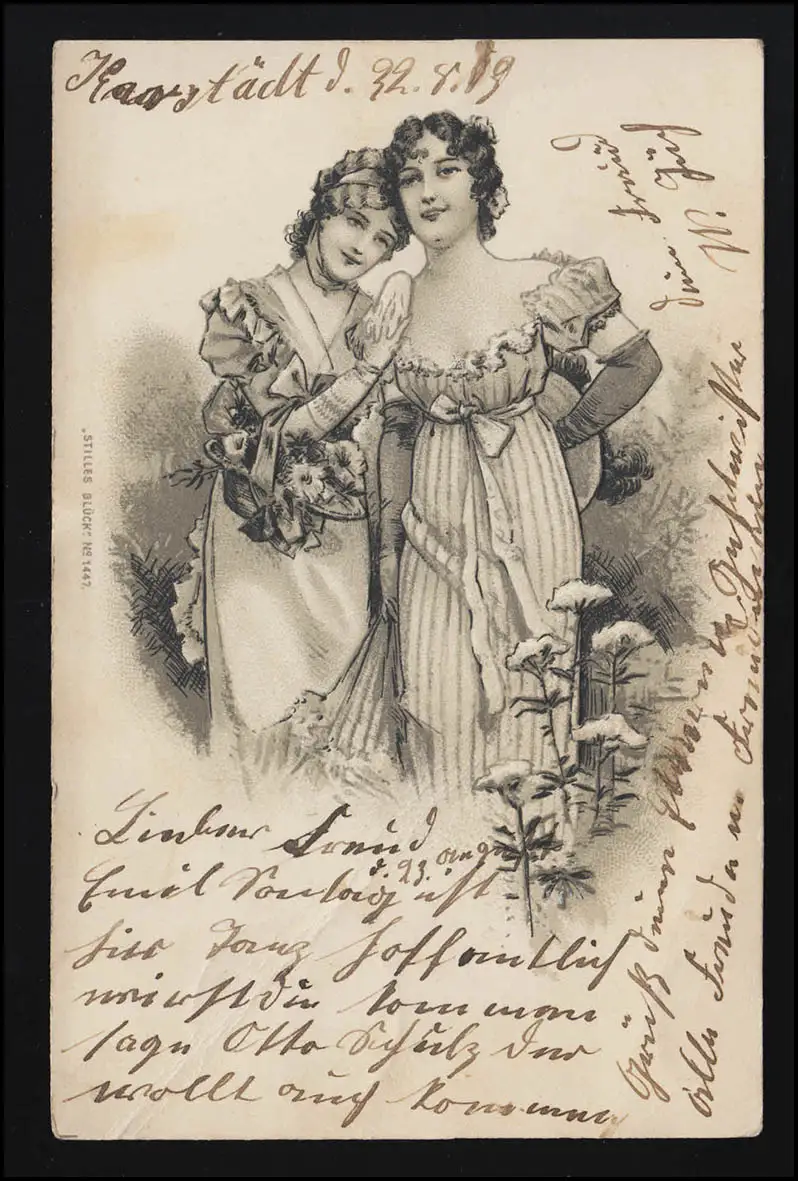 AK "Stilles Glück" No 1447, 2 junge Frauen vertraut im Garten, KARSTÄDT 22.8.03