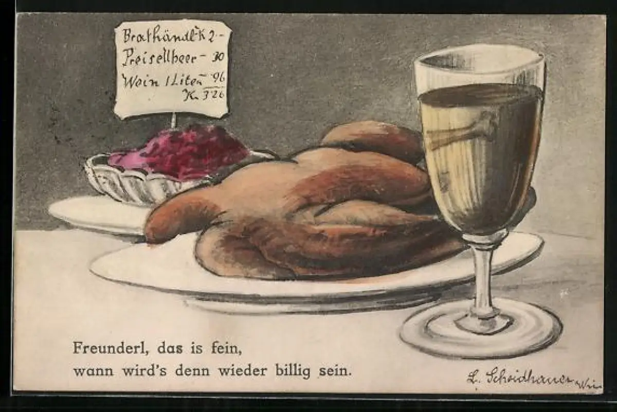 AK Stillleben mit Brathendl, Preiselbeeren und Wein