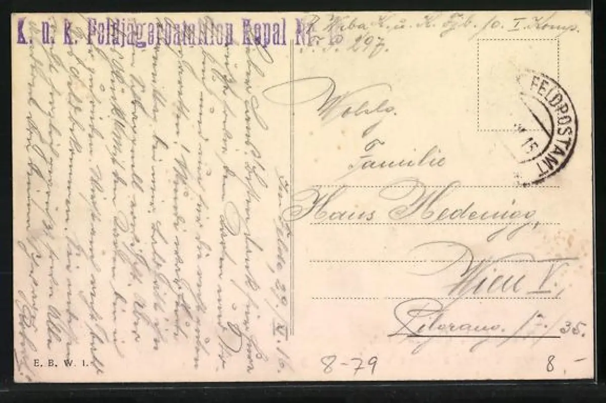 Personenbezogene Daten auf der Rückseite der Karte wurden durch blauen Textmarker unkenntlich gemacht. Die blauen Stellen sind auf die Vorderseite durchgeweicht und wirken sich negativ auf das Postkartenfoto aus