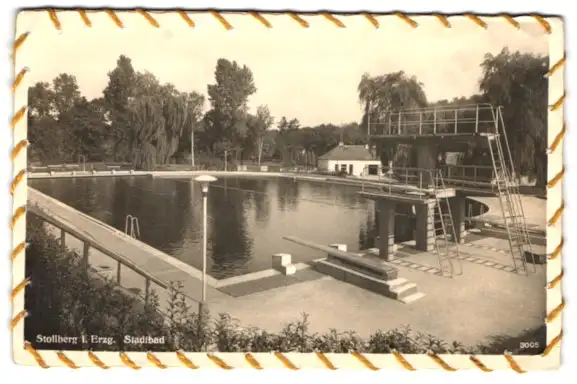 AK Stollberg i. Erzg., Stadtbad, Rand umnäht mit goldenem Garn