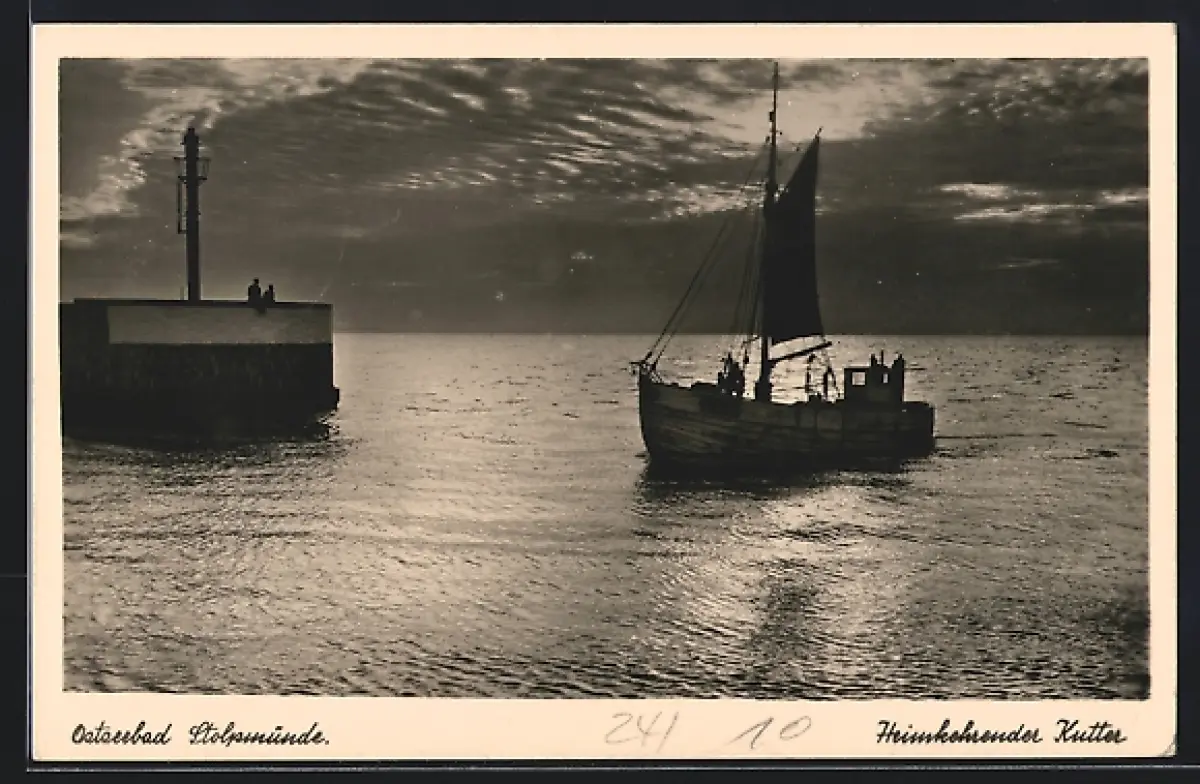 AK Stolpmünde, Hafeneinfahrt mit Leuchtfeuer und heimkehrenden Fischkutter STO-30