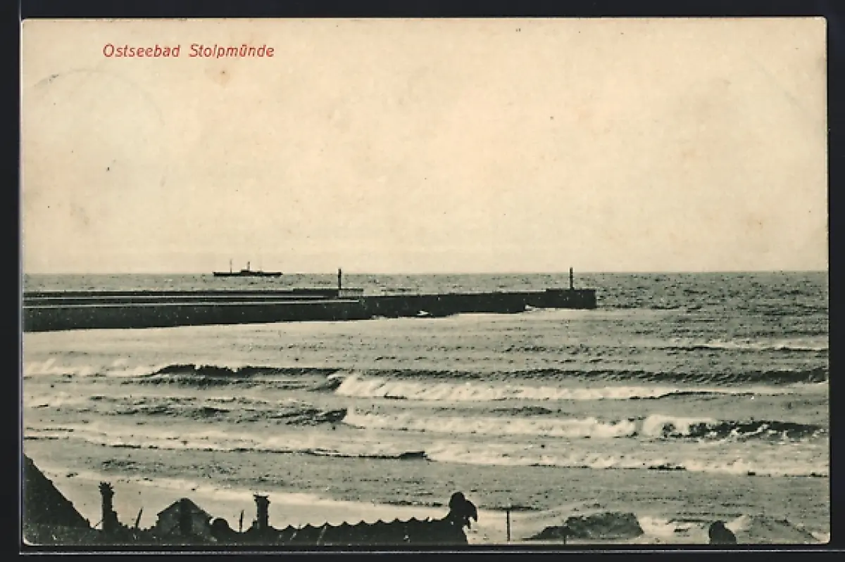 AK Stolpmünde, Hafenmole, Frachtschiff im Hintergrund