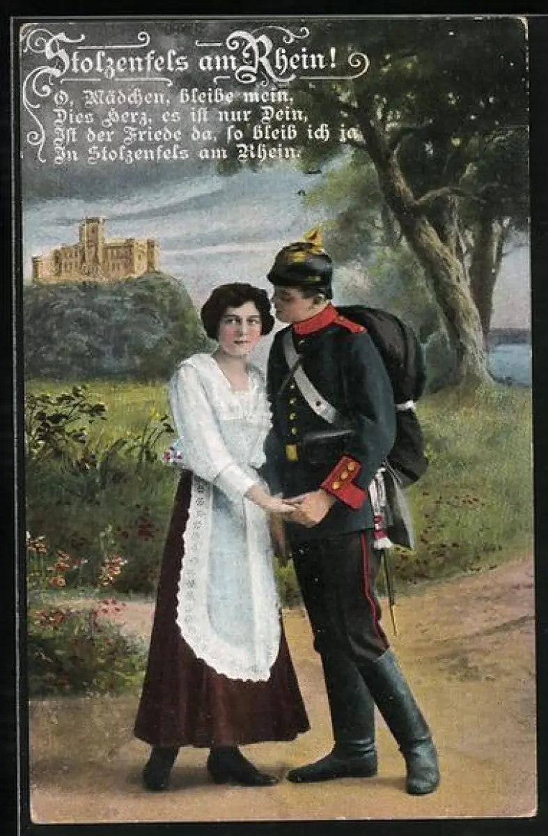 AK Stolzenfels am Rhein, Soldat in Uniform mit Frau und Gedicht